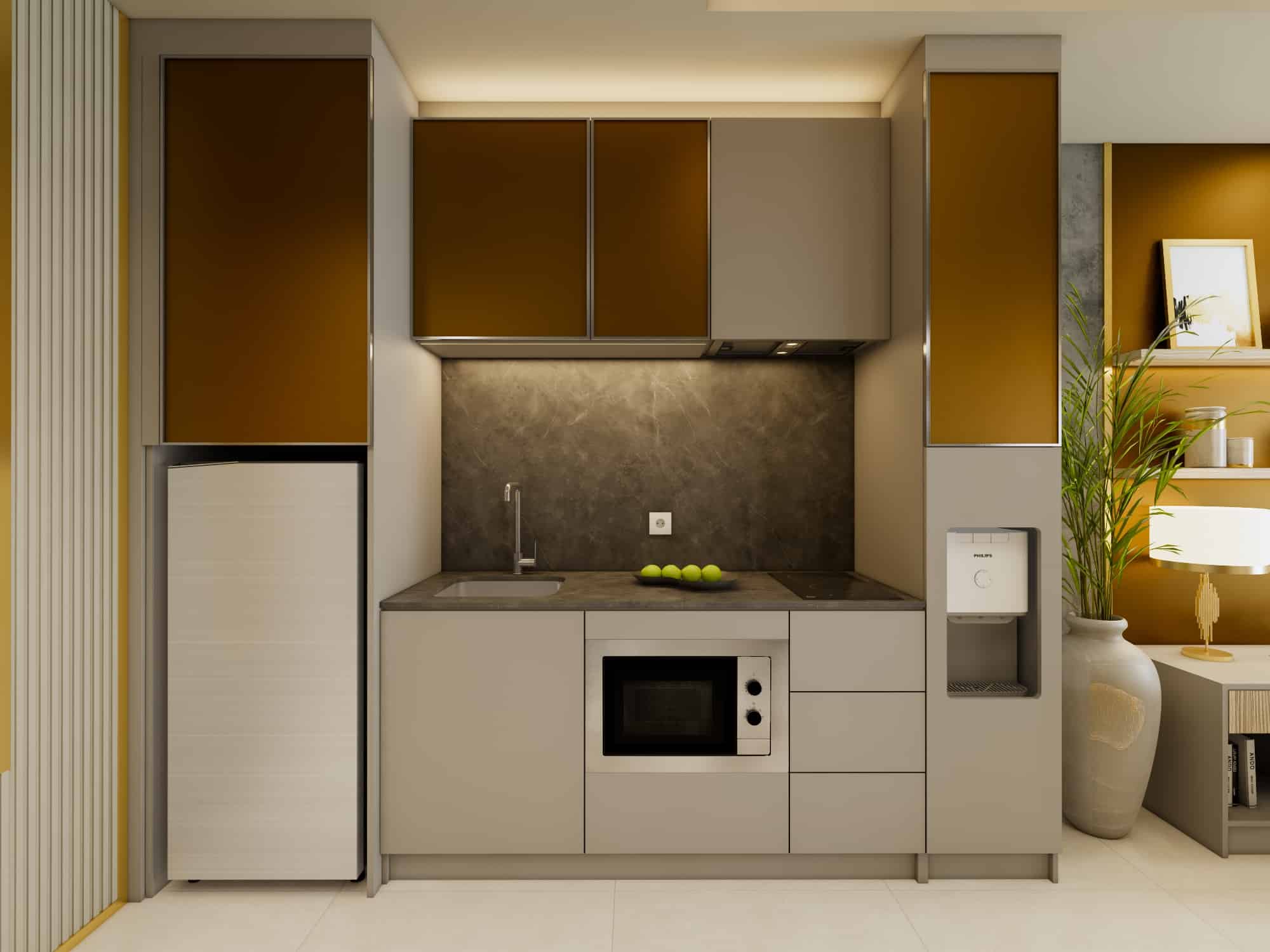 iDekore mengusung konsep modern minimalis untuk membuat unit apartemen ini terlihat maksimal dari segi fungsi dan pemanfaatan ruang. dengan Warna abu-abu dan emas memberikan tampilan yang klasik dan mewah, sementara juga memberikan nuansa yang hangat dan nyaman. Kombinasi warna yang netral dan hangat ini memberikan kesan yang tenang dan nyaman, sementara juga memberikan sentuhan glamor yang mewah.