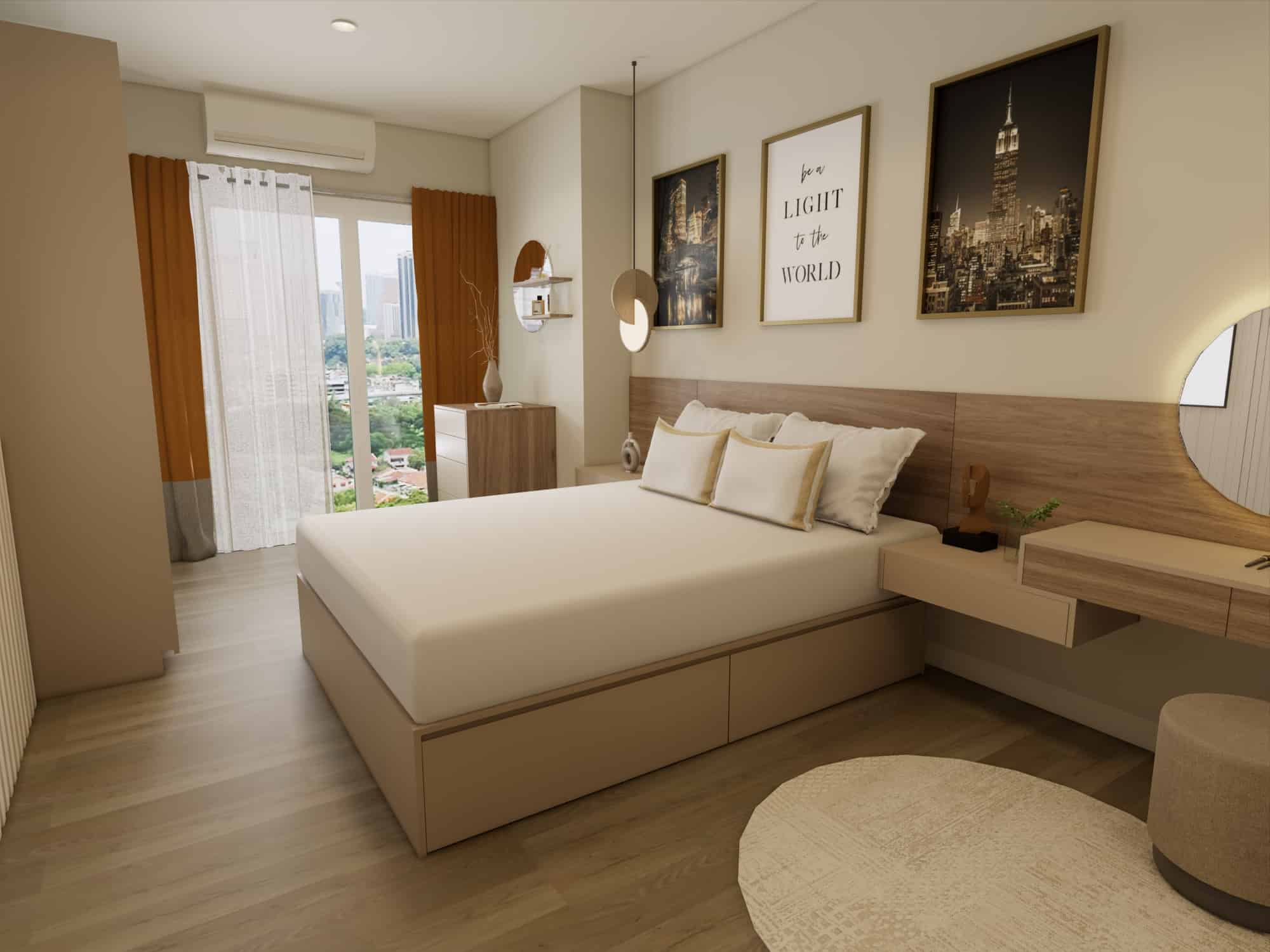 iDekore mengusung konsep modern minimalis untuk membuat unit apartemen ini terlihat maksimal dari segi fungsi dan pemanfaatan ruang. Apartemen 2 kamar tidur dengan warna alami memberikan kesan yang tenang dan damai di dalam hunian. Warna alami seperti coklat, beige, dan putih adalah warna yang sangat cocok untuk diaplikasikan dalam desain interior apartemen. Furnitur seperti meja dan rak dapat menggunakan material kayu alami yang memberikan kesan yang hangat dan natural. Pemilihan perabot pun disesuaikan dengan persisi sehingga tidak akan terjadi salah membeli furniture karena salah ukur.
